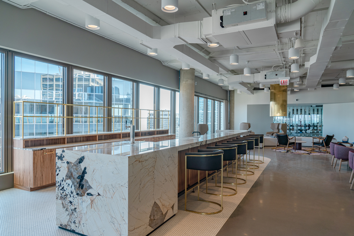 The use of various stone, blended with mixed metals, create an inviting atmosphere perfect for any special event, highlighted by trendy leather bar stools, cozy banquettes enhanced with a marble bar waiting to serve a craft cocktail. Corporate or social, business or pleasure, The Lighthouse is a versatile and inviting venue for any gathering.